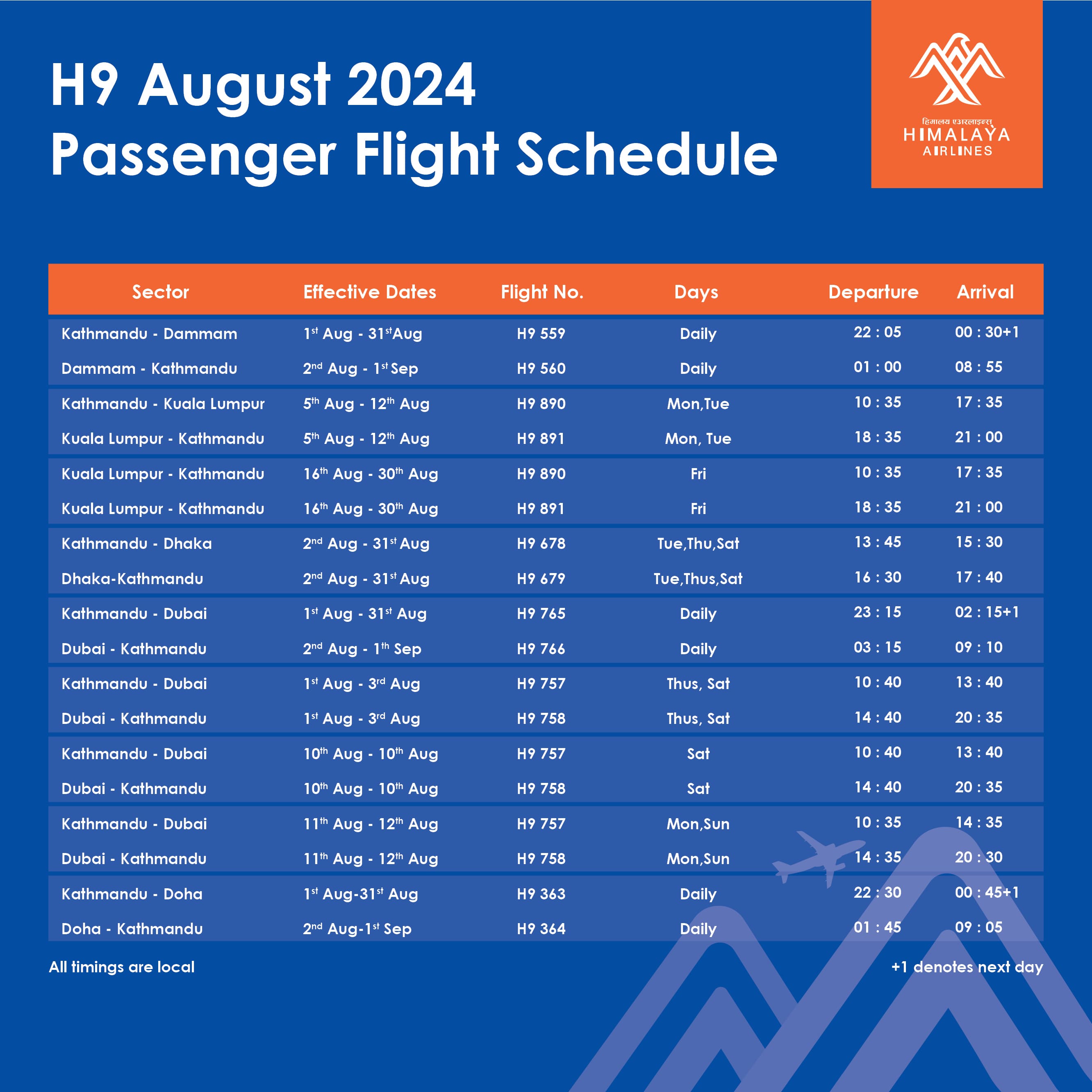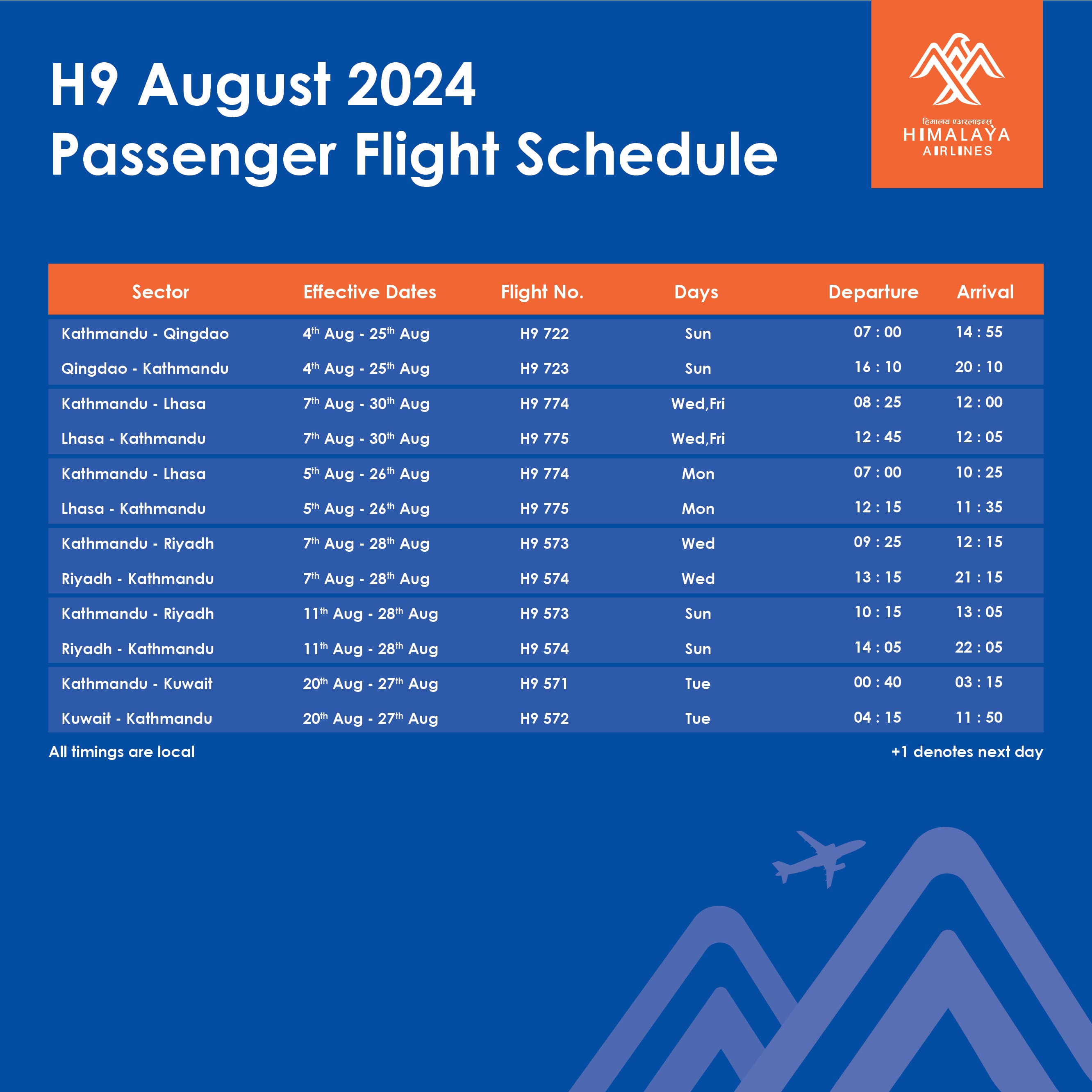 H9 August 2024 Passenger Flight Schedule