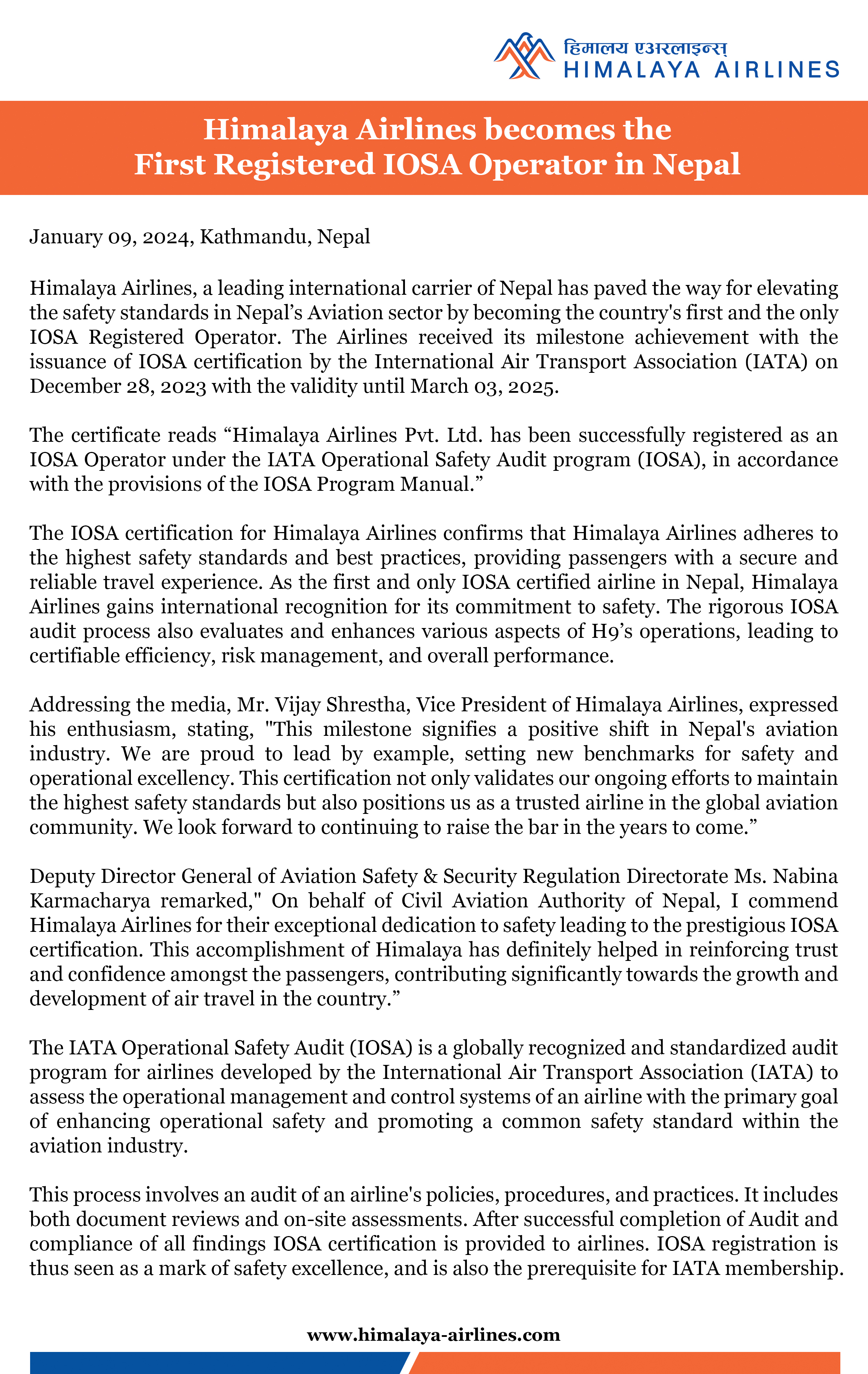喜马拉雅航空成为尼泊尔首家注册 IOSA 运营商