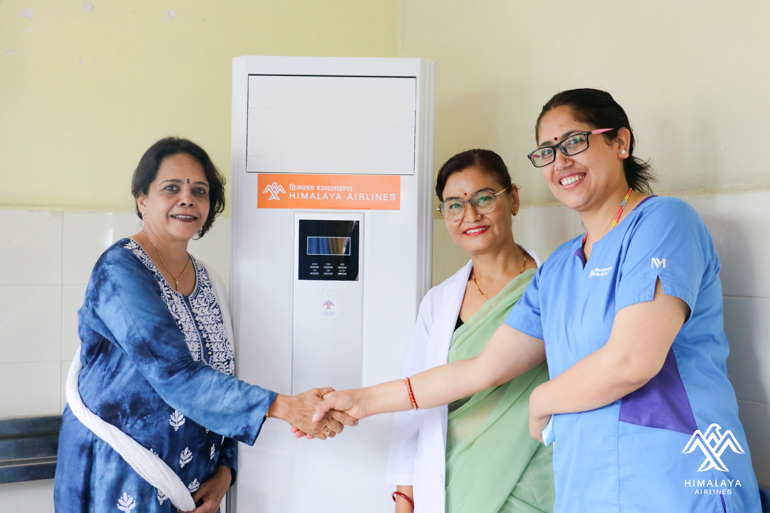 Himalaya Airlines Pvt. Ltd., committed to fulfill its core CSR objective of Societal Responsibility took steps to enforce its CSR activities in the healthcare sector. At the handover ceremony held on July 16, 2023, Mr. Zhou Enyong, President of the airlines handed over a 2-ton standing Air Conditioner to Mr. Samden Lama Chairperson and Dr. Kailash Kumar Bhandari, Medical Director of NDA-Nepal Orthopedic Hospital.