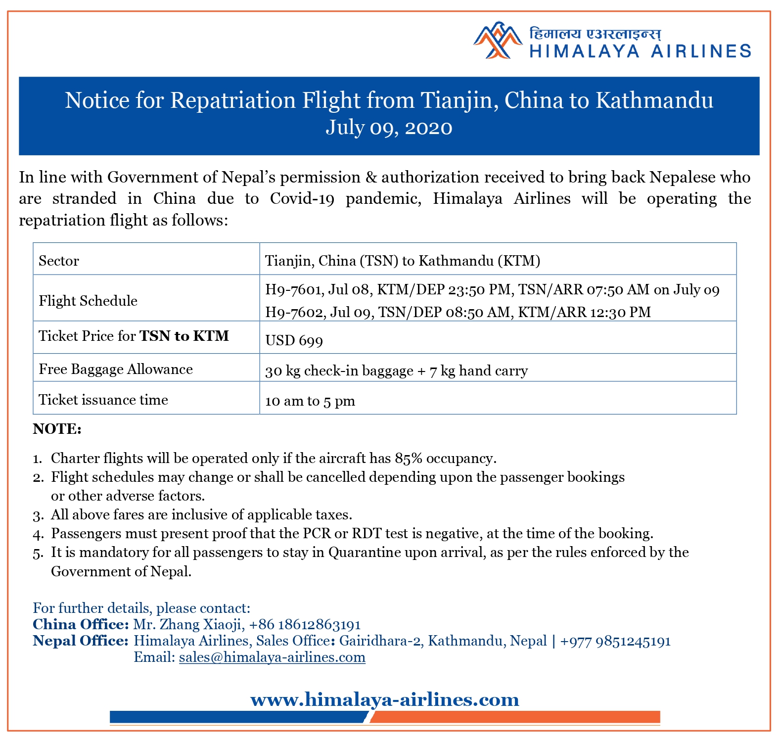 Repatriation Flight from Tianjin to Kathmandu - Jul 09, 2020