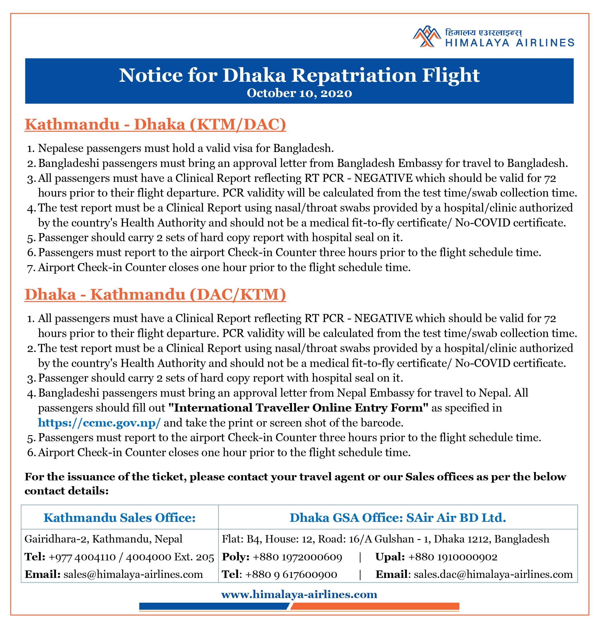 Notice for Dhaka Repatriation Flight - Oct 10, 2020