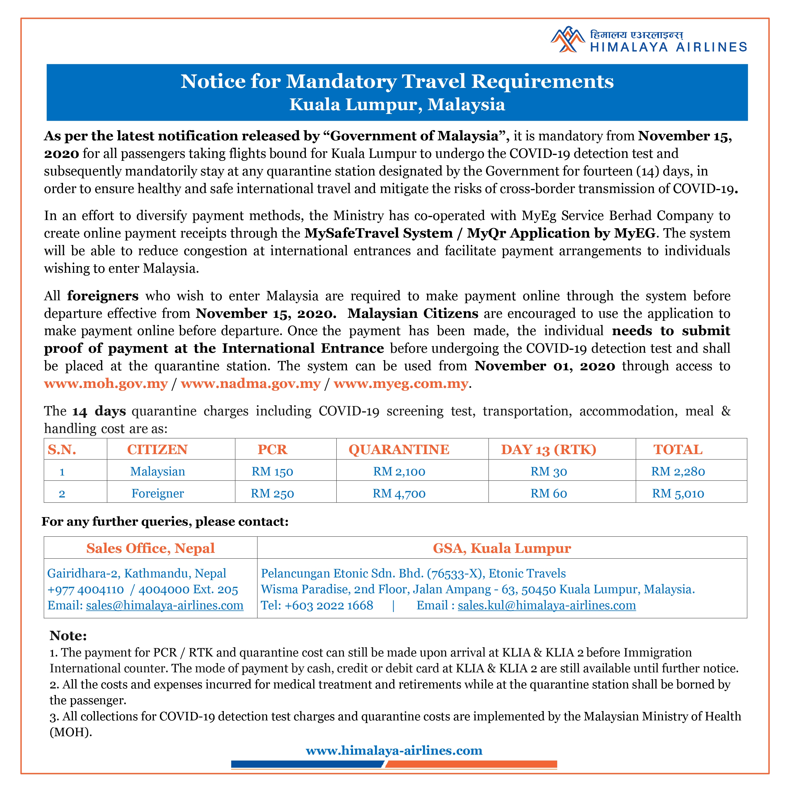 Mandatory Travel Requirement for passengers bound to Malaysia