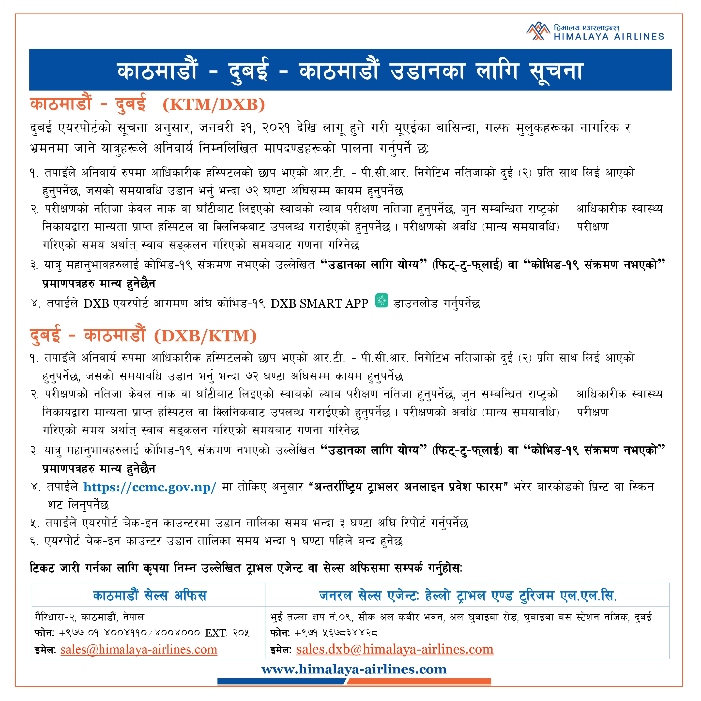 Kathmandu - Dubai - Kathmandu Flight - W.E.F. Jan 31, 2021
