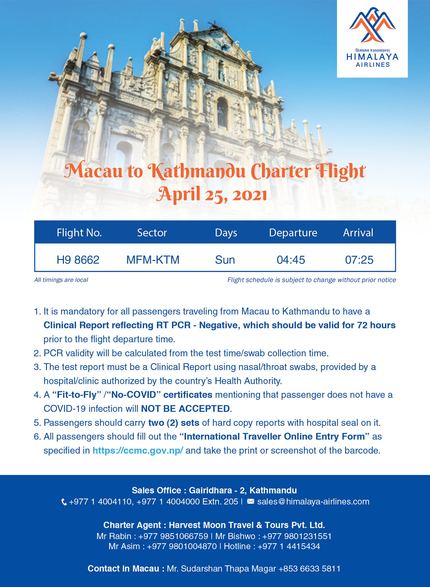 Macau - Kathmandu Charter Flight - April 25, 2021