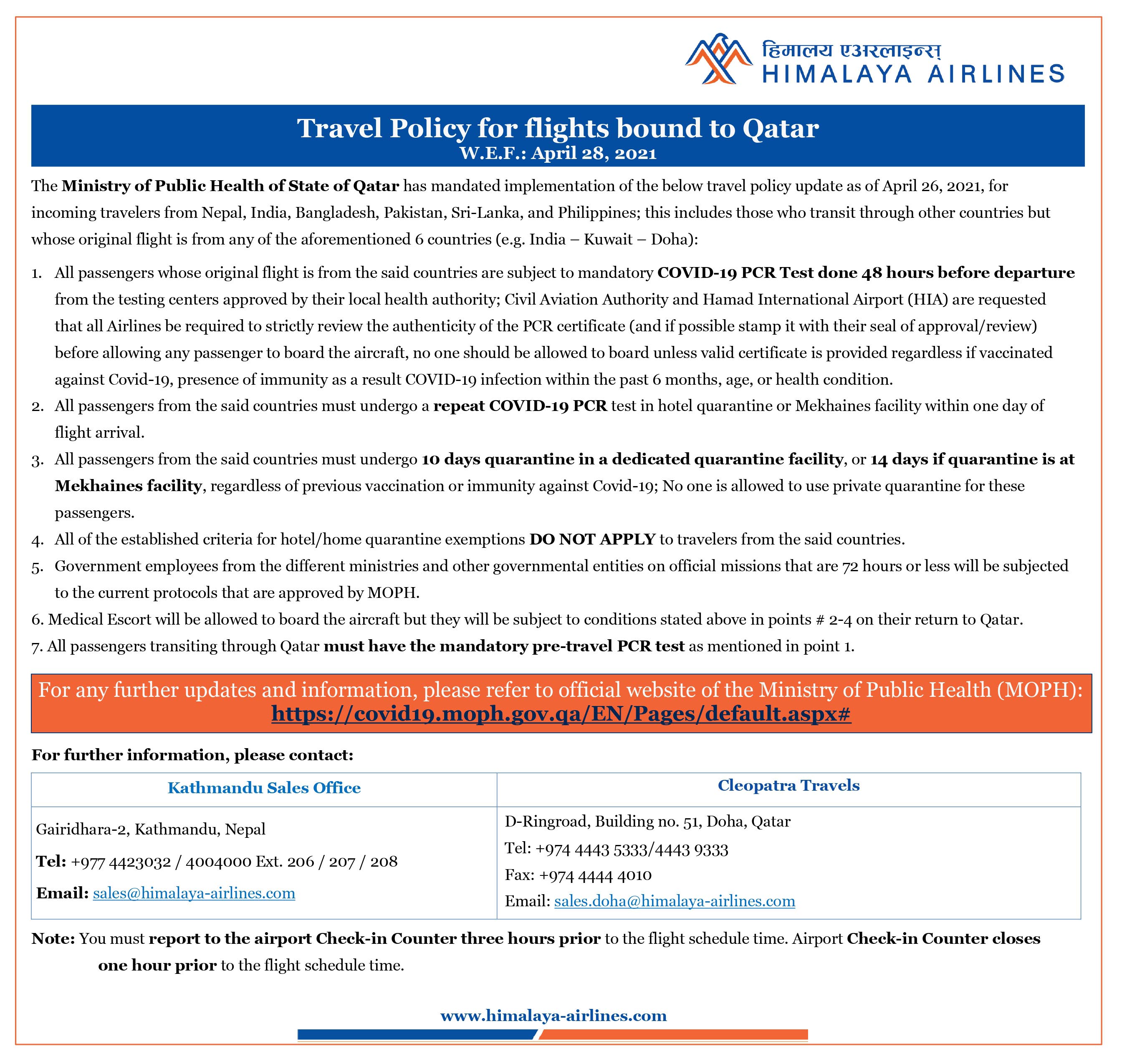 Travel Policy for Flights Bound to Qatar, W.E.F. April 28, 2021