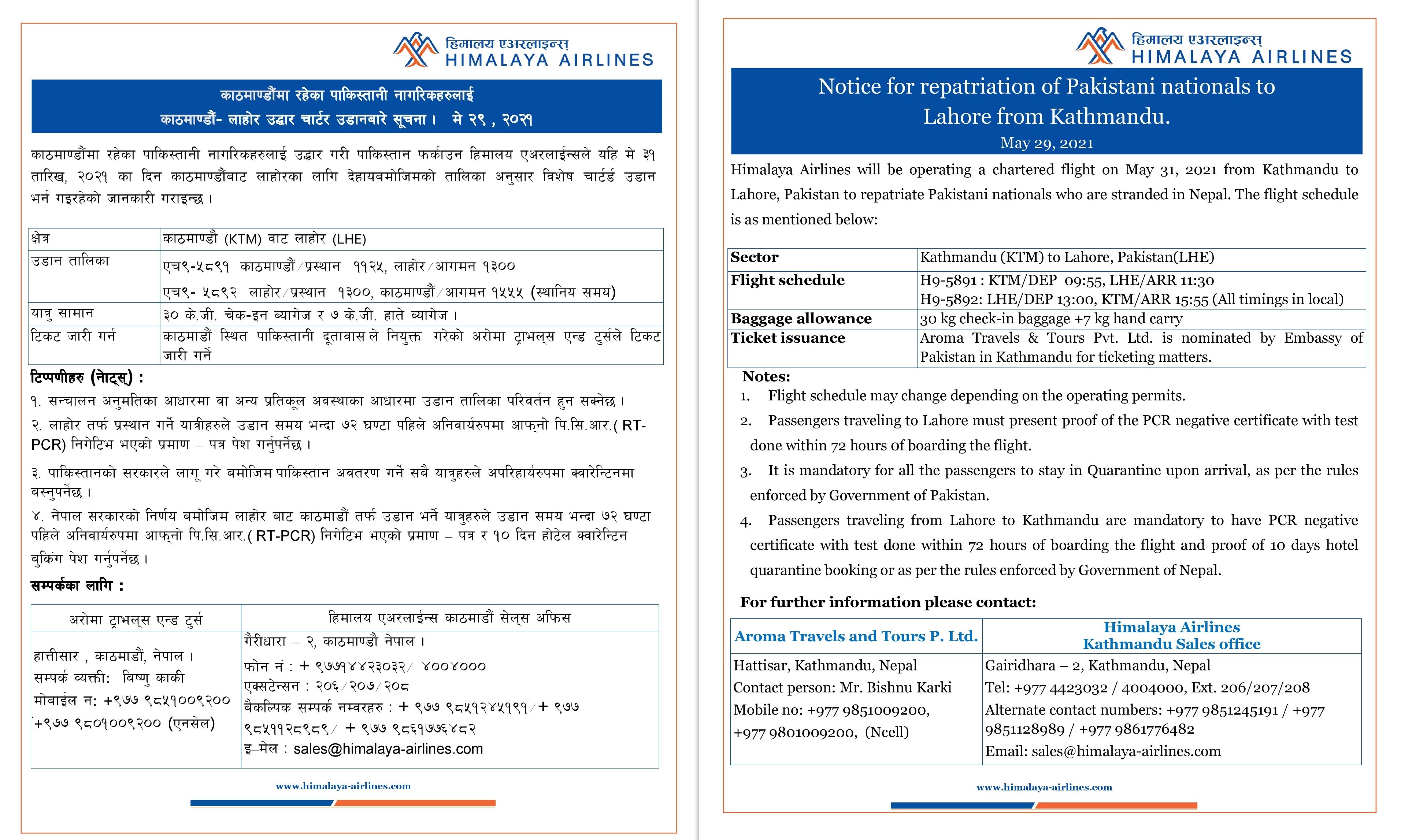 Notice for repatriation of Pakistani nationals to Lahore from Kathmandu