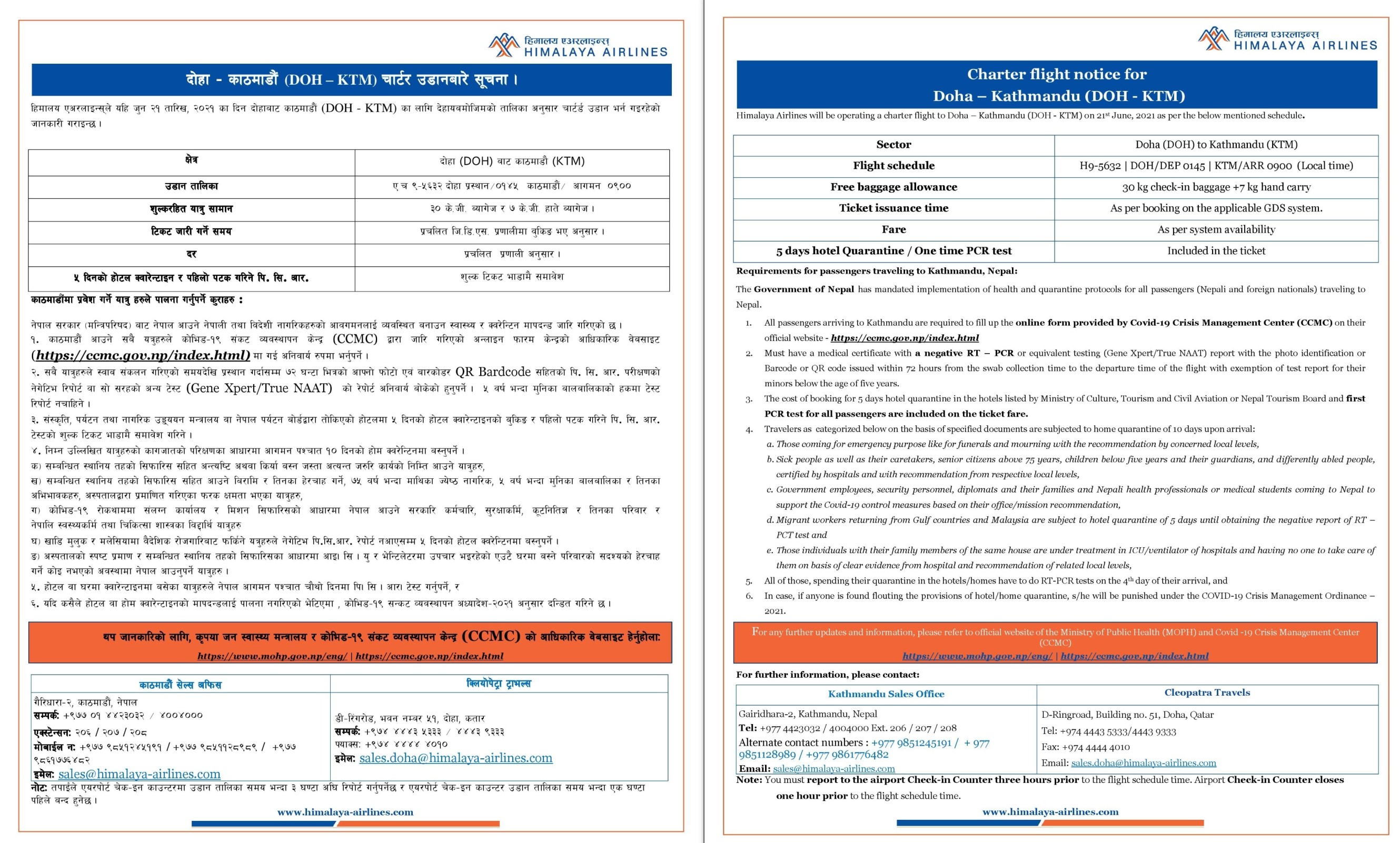 Charter Flight Notice for Doha-Kathmandu(DOH-KTM)