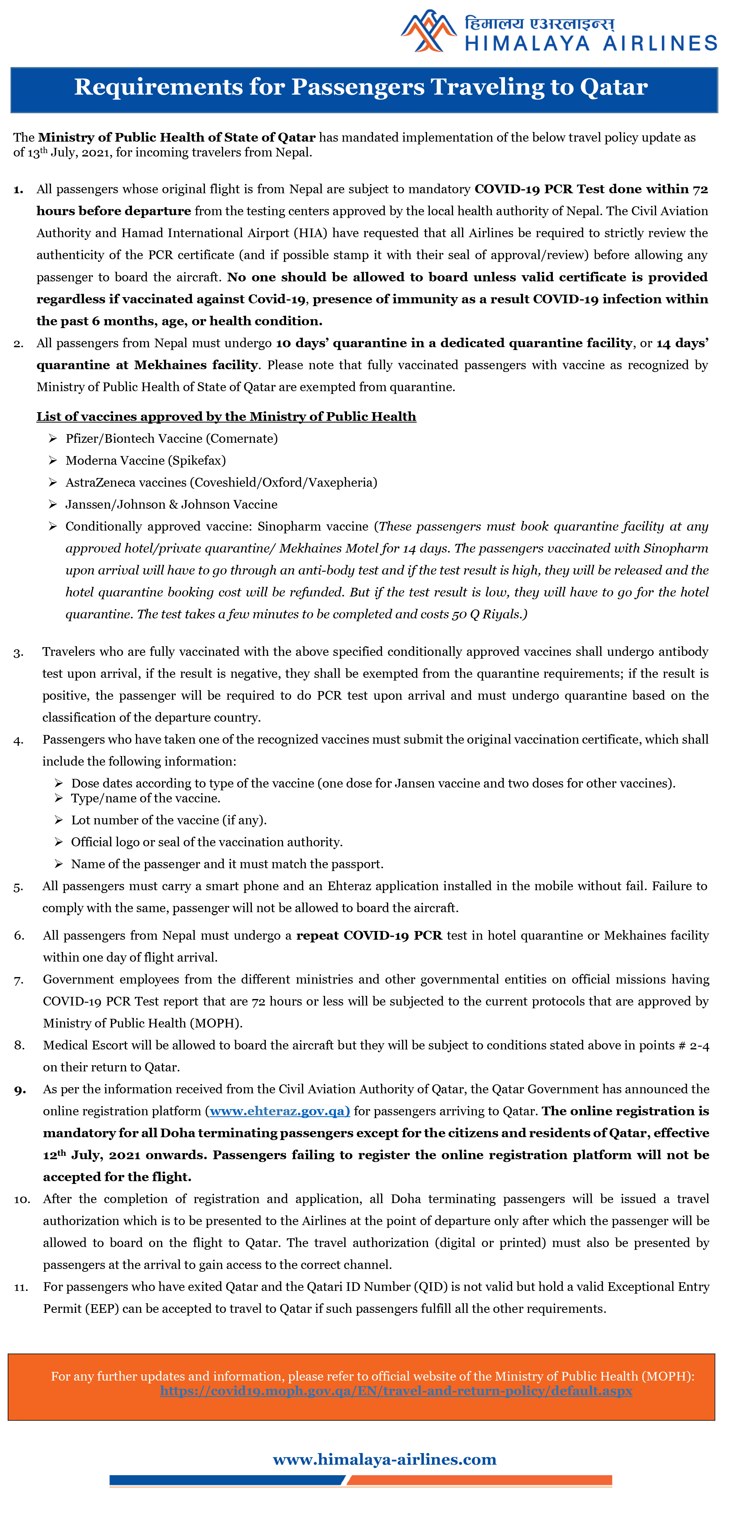 Requirements for passengers travelling to Qatar
