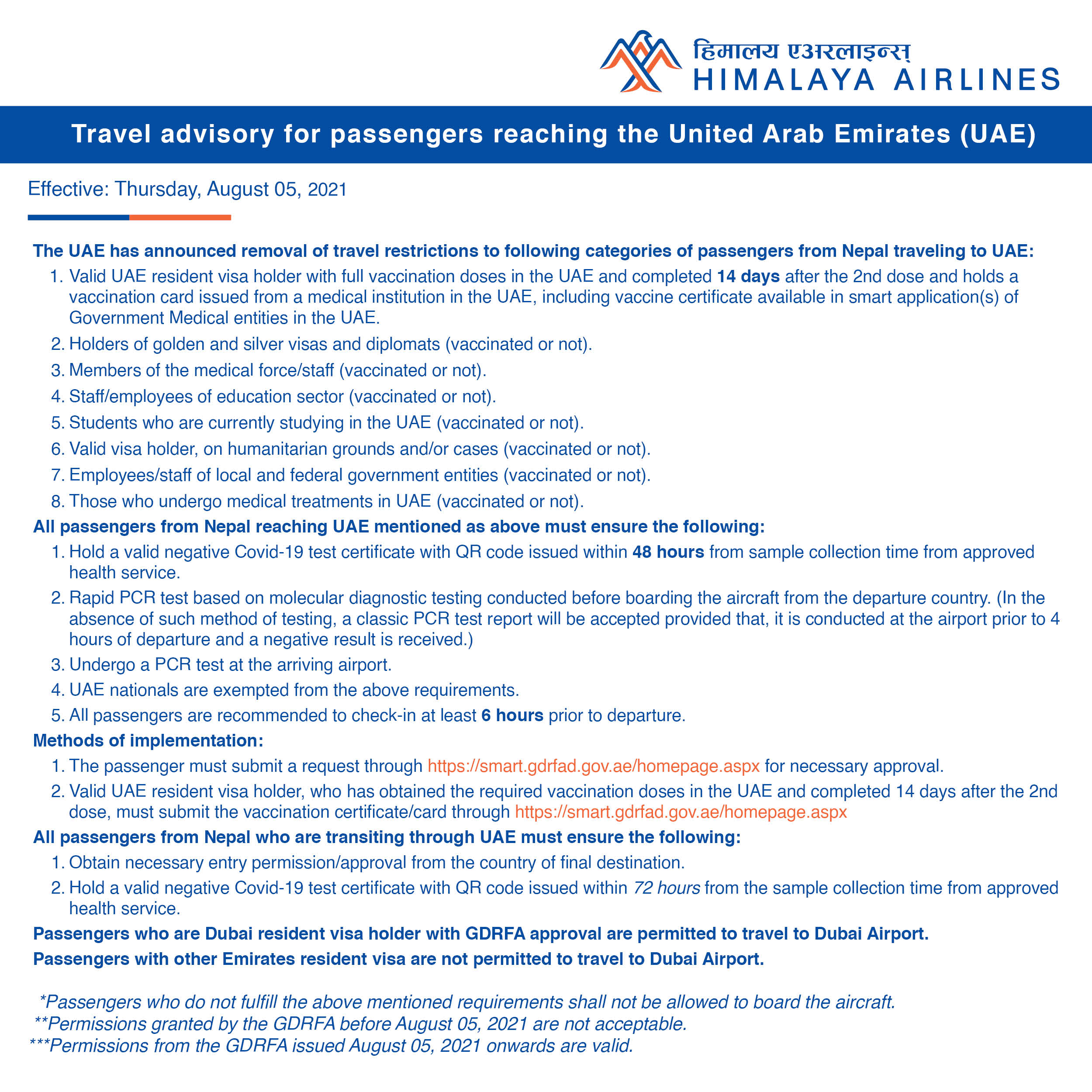 Travel advisory for passengers reaching the United Arab Emirates (UAE)
