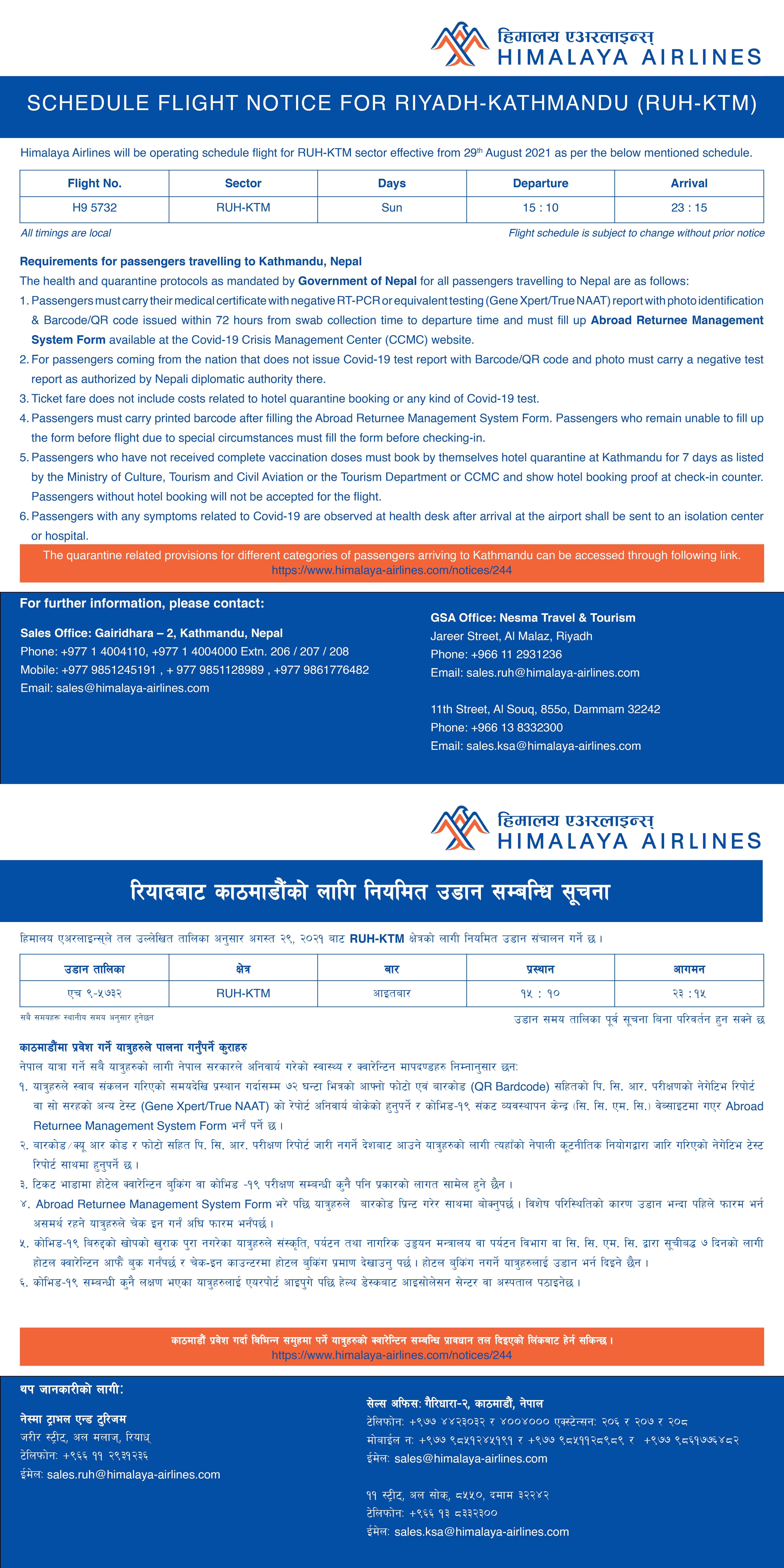 Schedule notice for Riyadh-Kathmandu (RUH-KTM)