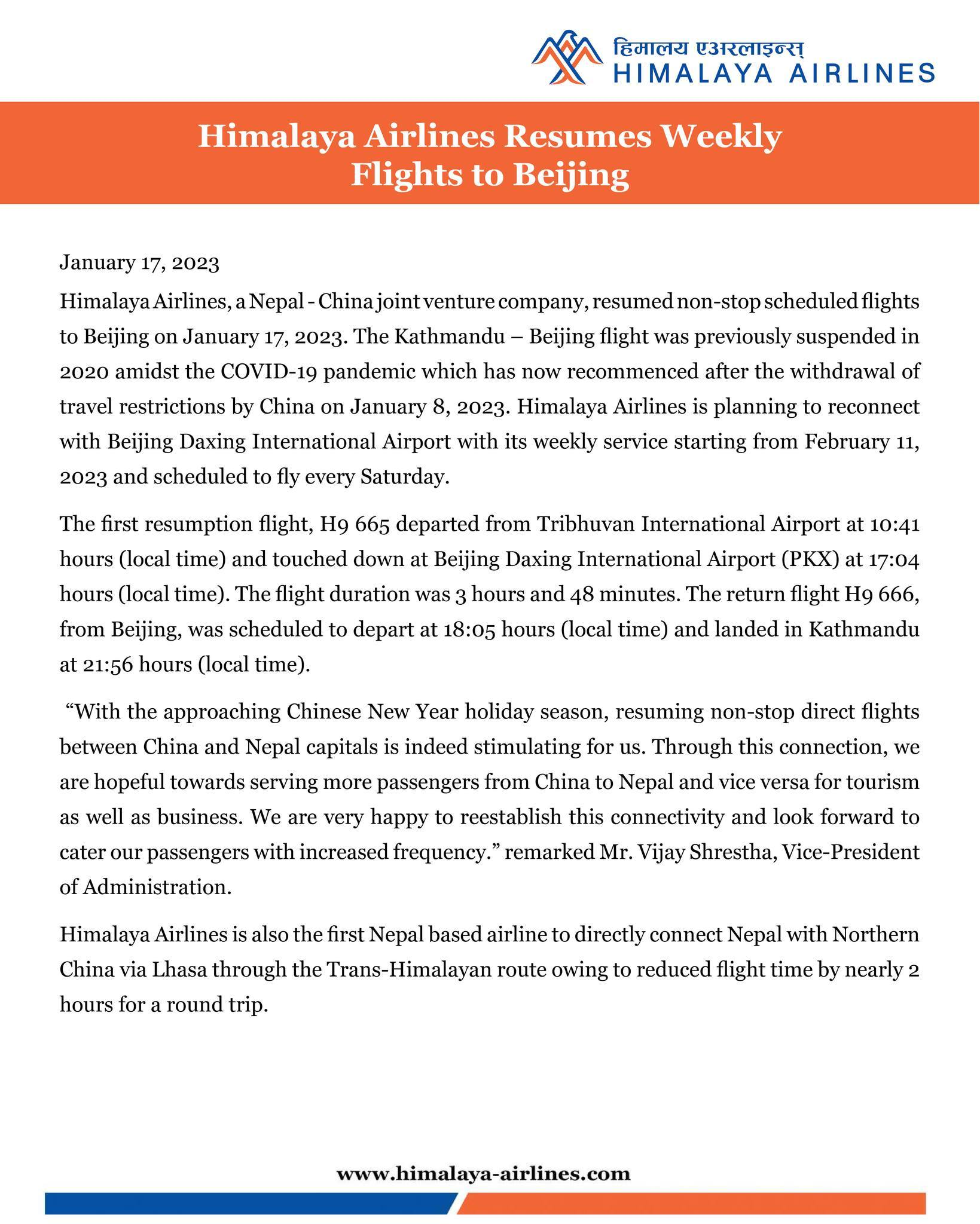 Himalaya Airlines Resumes Weekly Flights to Beijing