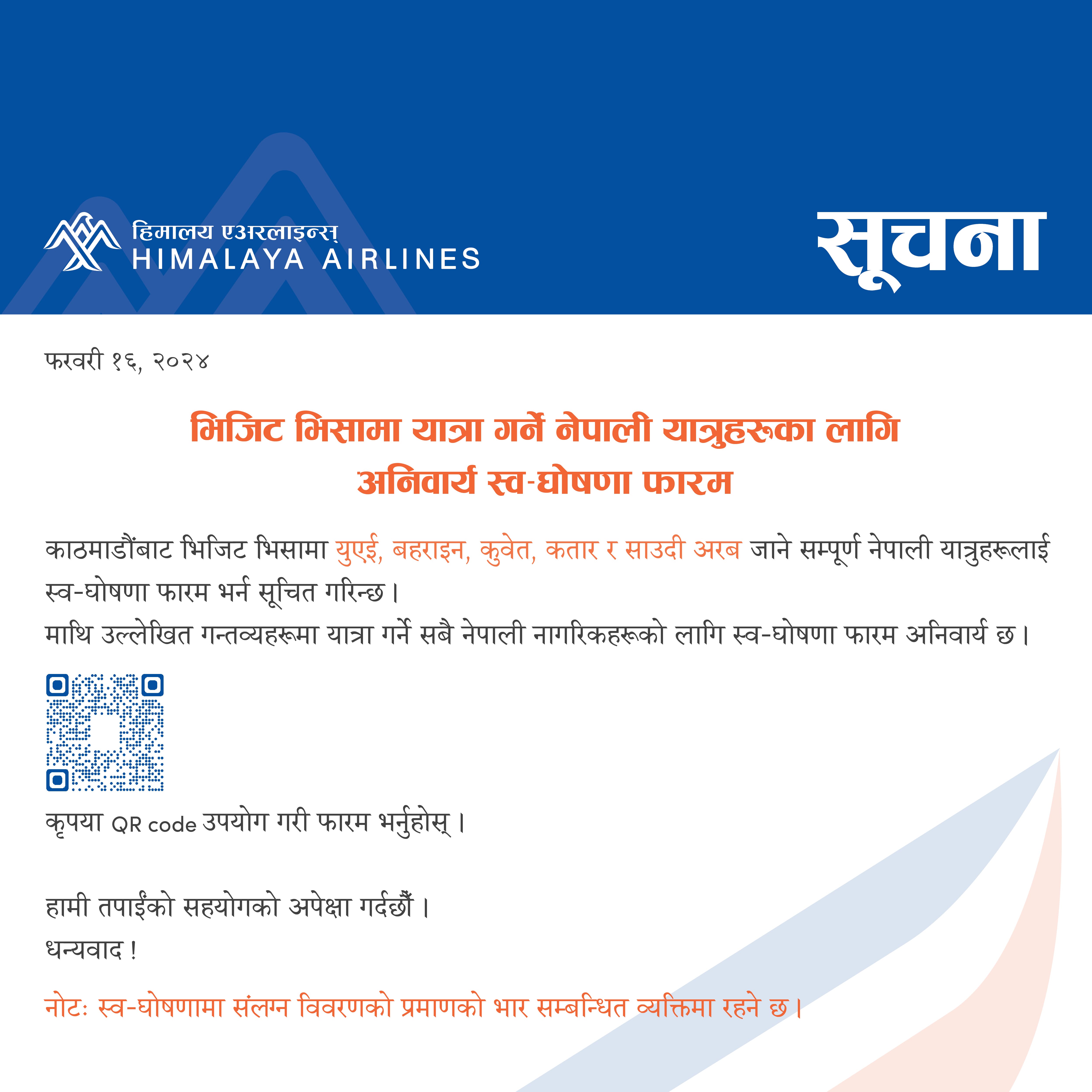 Mandatory Self-Declaration Form For Nepali Passengers Travelling on Visit Visa