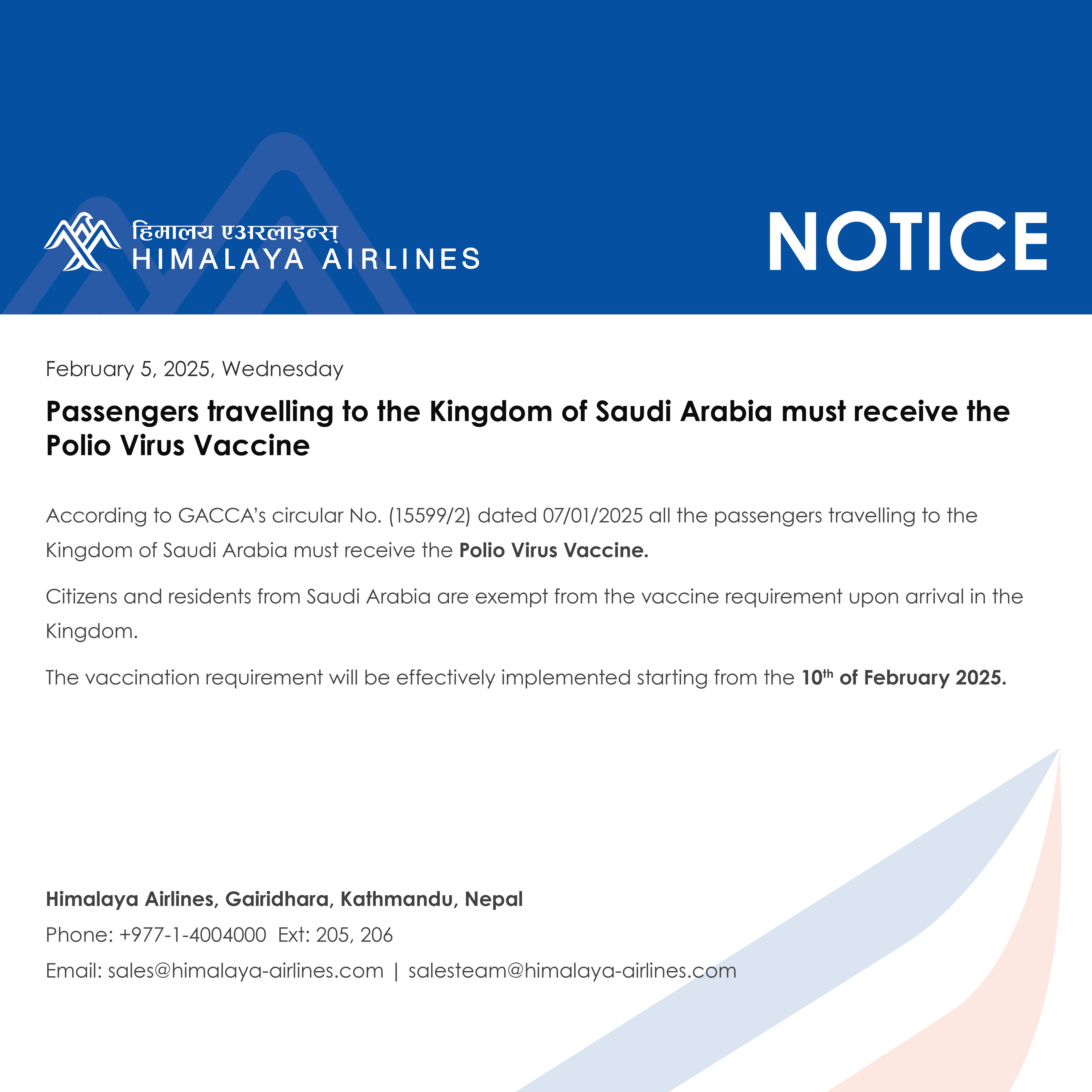 Passengers travelling to the kingdom of Saudi Arabia must receive Polio Virus Vaccine.